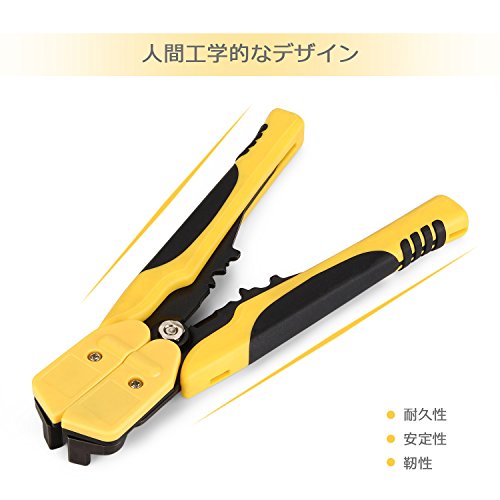 【ラインを破壊しない】伝統的ワイヤストリッパーより調節ネジを加えてラインを破壊しないし、刃口も利くのでスリップすることが避けでき、迅速に切断し、良好なラインが残される。<br>【多機能】ストリッパー、ワイヤーカット、簡易圧着、1ツールで三つ機能が搭載されます。単数ケーブルと多数ケーブルとも容易に切断できます。<br>【手触りが良い】グリップに優しいエラストマーを採用され、人間工学にぴったりして手心地がよく、連続作業が進んでいるとき、手への負担を軽減できます。<br>【耐久性】高品質の亜鉛合金ヘッドを採用され、耐久性が良い、超寿命なもので長時間利用しても大丈夫です。<br>【保証期間】本商品はご購入の日から18か月以内にご満足に合わない場合、弊社にお問い合わせくださいませ。