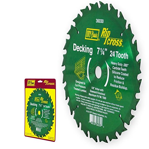 Arbor: 5/8-inch diamond knockout, Kerf: .079-inch, Hook: 20-degree. IVY Classic Industries is dedicated to producing a comprehensive, quality line of power tool accessories and hand tools. IVY Classic Ripcross Decking Carbide Saw Blades are designed for smooth, efficient ripping and crosscutting of pressure treated lumber. These hard-body blades are constructed for their outstanding cutting performance and feature alternate top bevel ground C3 modified tungsten carbide teeth. The silicon coated thin kerf reduces friction and residue build-up while the anti-kickback design ensures consistent chip removal.