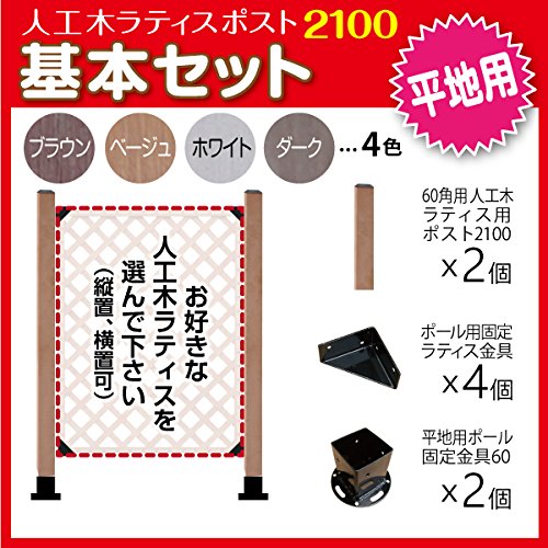 すぐ取り付けできて簡単設置。 セット内容 ・人工木ポスト2100×2本 ・サイズ:約)2100×60×60mm ・材料:人工木材 ・色:ブラウン/ベージュ/ホワイト/ダークブラウン ・重量:(約)6kg ・ポール固定ラティス金具(aks-35397)×4 ・サイズ:70×70×35mm ・重量:120g 取付用ビス付 ・平地用ポール固定金具(60mm角用) ×2 サイズ:円の部分:約φ140mm ポールを収める四角部分:一辺約80mm ポールを収める四角部分深さ:約100mm ポール取付用ビス付。 ご利用のポールの太さをご確認のうえご注文ください。 ※平地に固定するアンカーボルトは付属しておりませんので別途ホームセンター等でお買い求めください。 ご注意 ラティスフェンスはセット内容に含まれていません。 ラティスフェンスを設置するために必要な部材のセット販売となります。