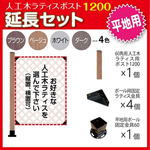 すぐ取り付けできて簡単設置。 セット内容 ・人工木ポスト1200×1本 ・サイズ:約)1200×60×60mm ・材料:人工木材 ・色:ブラウン/ベージュ/ホワイト/ダークブラウン ・重量:(約)4kg ・ポール固定ラティス金具(aks-35397)×4 ・サイズ:70×70×35mm ・重量:120g 取付用ビス付 ・平地用ポール固定金具(60mm角用) ×1 サイズ:円の部分:約φ140mm ポールを収める四角部分:一辺約80mm ポールを収める四角部分深さ:約100mm ポール取付用ビス付。 ご利用のポールの太さをご確認のうえご注文ください。 ※平地に固定するアンカーボルトは付属しておりませんので別途ホームセンター等でお買い求めください。 ご注意 ラティスフェンスはセット内容に含まれていません。 ラティスフェンスを設置するために必要な部材のセット販売となります。