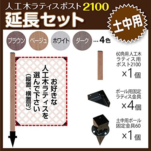 すぐ取り付けできて簡単設置。 セット内容 ・人工木ポスト2100×1本 ・サイズ:約)2100×60×60mm ・材料:人工木材 ・色:ブラウン/ベージュ/ホワイト/ダークブラウン ・重量:(約)6kg ・ポール固定ラティス金具(aks-35397)×4 ・サイズ:70×70×35mm ・重量:120g 取付用ビス付 ・土中用ポール固定金具セット(60mm用)35410-58624×1 ・サイズ: 土中に埋まる三角の部分:長さ約350mm円の部分:約φ140mm ポールを収める四角部分:一辺約60mm ポールを収める四角部分深さ:約100mm 取付用ビス付。 ご利用のポールの太さをご確認のうえご注文ください。 ※土中にさしこむ金具とポストを取り付ける金具の二つをボルトでジョイントして使用します。 ご注意 ラティスフェンスはセット内容に含まれていません。 ラティスフェンスを設置するために必要な部材のセット販売となります。