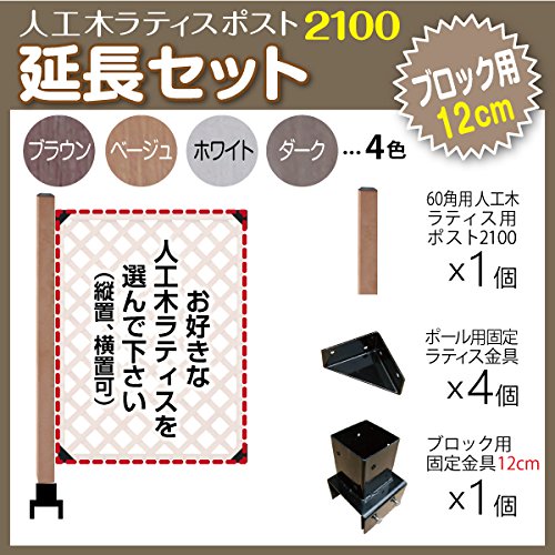 すぐ取り付けできて簡単設置。 セット内容 ・人工木ポスト2100×1本 ・サイズ:約)2100×60×60mm ・材料:人工木材 ・色:ブラウン/ベージュ/ホワイト/ダークブラウン ・重量:(約)6kg ・ポール固定ラティス金具(aks-35397)×4 ・サイズ:70×70×35mm ・重量:120g 取付用ビス付 ・ブロック用角ポール(60mm)固定金具 12cm用×1 コンクリートブロックの幅12cmに対応します ご注意 ラティスフェンスはセット内容に含まれていません。 ラティスフェンスを設置するために必要な部材のセット販売となります。