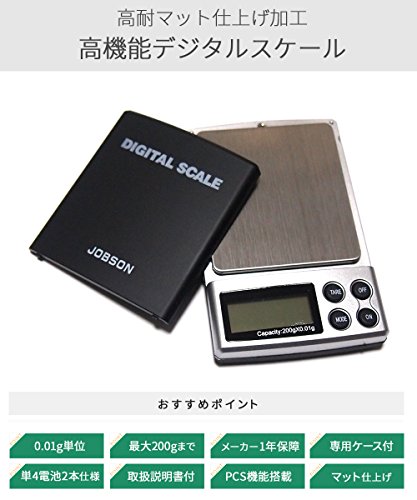 JOBSON プロ仕様 デジタル スケール / キッチンスケール 0.01g 単位 200g まで 精密 計量秤 電子 計量器 はかり キッチン 料理 電池残量 確認 機能 搭載 高耐マット 仕上げ メーカー12ヶ月保証