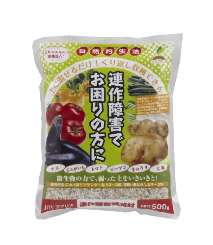 「JOY AGRIS 連作障害軽減材 500g」は、有用微生物とゼオライトの力で土壌を改善し病原菌の増殖を抑える土壌栄養剤です。土をやわらかくして根を元気に生育させます。