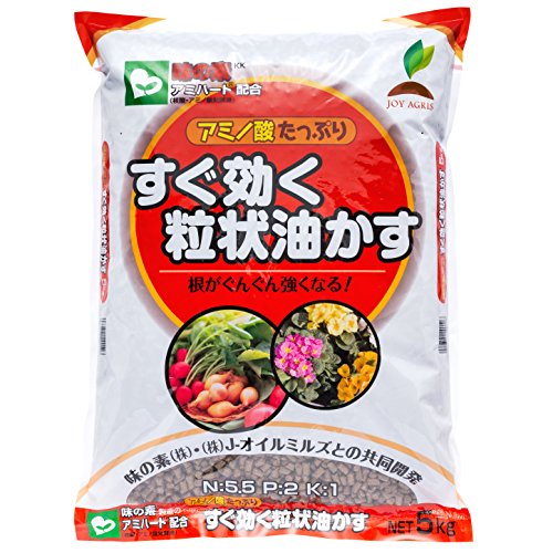 ●【商品説明】●「JOY AGRIS すぐ効く粒状油かす 5kg」は、なたね油かすに味の素KKの液体肥料『アミハート』を吸着させた有機質100%の肥料です。●成分が水に溶けだし、直接根まで届くため即効性があり、根張りをよくし収穫量も上がります。●家庭園芸専用。●【使用方法】●植物の種類や大きさ、生育状況に合わせて施肥の量を加減し、特に肥料の与えすぎには注意してください。●骨粉や草木灰など、リン酸・カリを多く含む肥料と組み合わせて使用すると、栄養バランスも良く効果的です。●使用後、カビや虫が発生することがあります。●気になるようでしたら土を薄く被せてください。●(発生するカビや虫は植物に害はありません)●【ご注意】●お子様の手の届かないところに保管してください。●空き袋をかぶったりすると危険です。●取り扱いにご注意ください。●食品ではありませんので、人又はペットが食べないようにご注意ください。●万一誤って食べた場合には、医師・獣医師にご相談ください。●商品の裏面文書をよく読んでからご使用ください。●虫やカビが発生することがありますが、肥料効果等に影響はあ...