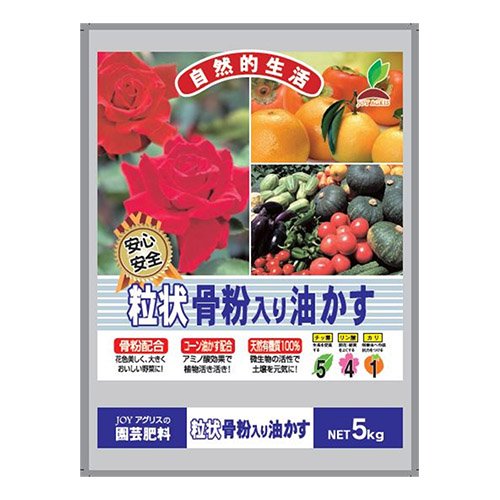 ●【商品説明】●「JOY AGRIS 粒状骨粉入り油かす 5kg」は、従来のなたね油かすに、骨粉、コーン胚芽油かすを配合した、天然有機質100%の肥料です。●骨粉のりん酸が植物の光合成を促進し、デンプン・糖の生産を高めます。●【お問い合わせ先】●株式会社JOYアグリスお客様センター0120-519-415●【成分】●チッ素5%、リン酸4%、カリ1%●【ご注意】●お子様の手の届かないところに保管してください。●空き袋をかぶったりすると危険です。●取り扱いに注意してください。●食品ではありませんので、人又はペットが食べないようにご注意ください。●万一誤って食べた場合には、医師・獣医師にご相談ください。●天然の有機物ですので虫やカビが発生することがあります。●使用後は密封し、湿気の少ない所に保管してください。●万一虫やカビが発生しても肥料効果等に影響はありません。●【使用方法】●計量の目安100g・・・紙コップ約1杯10g・・・大さじ約1杯●元肥として鉢植え:15-20gプランター:30-40g花壇・菜園:約500g果樹・花木:1本当たり500-600g...