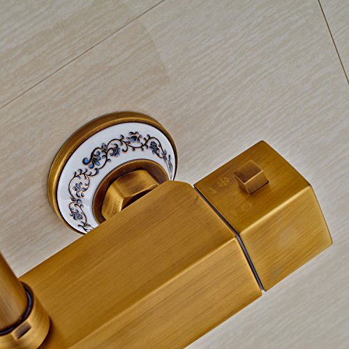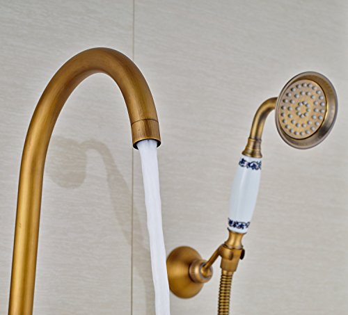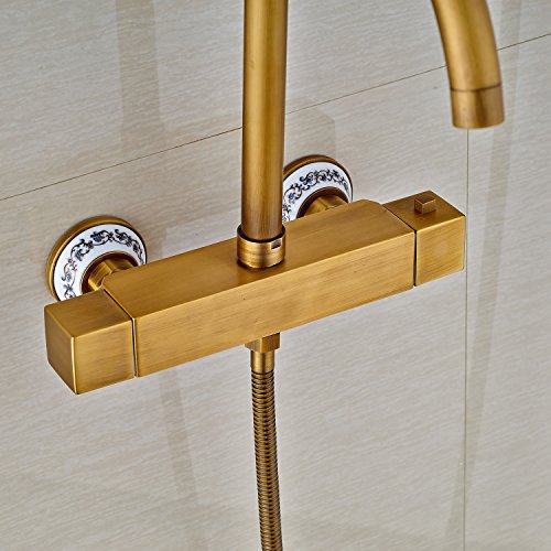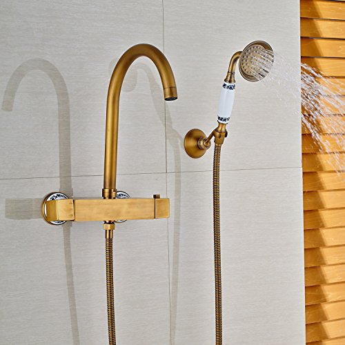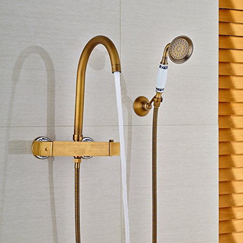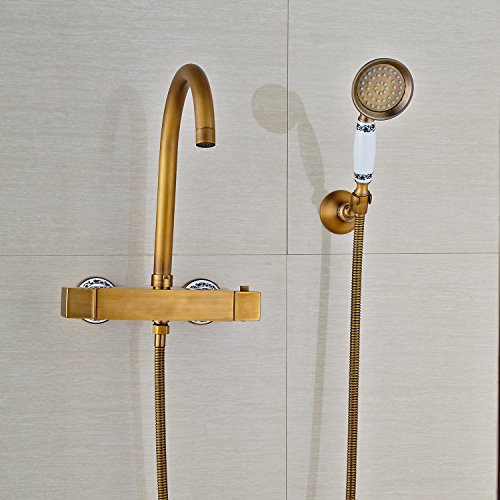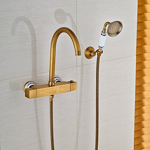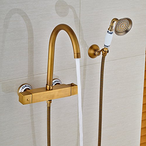Rozin サーモスタット バスタブの蛇口 ハンドシャワー装備 アンティーク真鍮 浴槽 風呂桶用 混合栓 壁取り付け