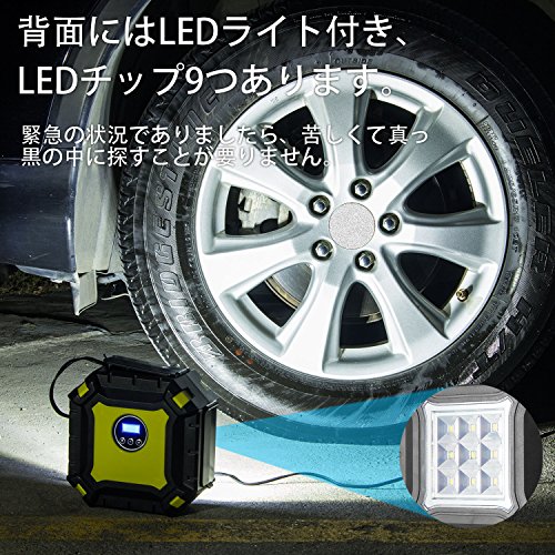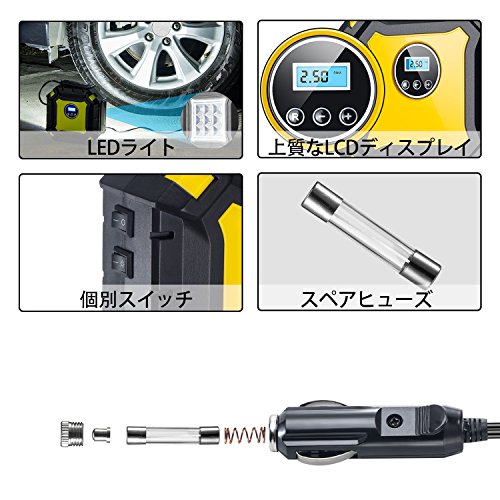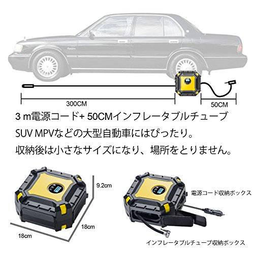 エアコンプレッサー: 静か、穏やか、耐用、安全 見事な性能携帯車用空気入れはタイヤに空気入れることだけではなくて、圧力計付でタイヤの圧力測定が行え、デジタル表示で、簡単に読み取れます。永久磁石同期電動機を使るため、タイヤに空気入れると、安全だし、静かだし、耐久性もいいし、安定します。自動的に停止する本製品は知的制御システムを使って、自動的に停止することができます。指定の気圧を設定して、ONボタンを押します。設定気圧になりましたら、自動的に停止します。 LEDライト LEDライトを搭載して、見通しの悪い夜中で途中タイヤ空気圧が不足緊急場合、自分で簡単に解決します。携帯便利と便利に空気入れ方法タバコソケットを車のコンセントに差し込んで、電源を入れるだけでタイヤに動いて空気が入ります。そして、電線が3メートルで、空気管が0.5メートルで、前後のタイヤに気軽に空気補充します。幅広い場面で使える三種のアダプターが付き、自動車、トラック、自転車、バイク、キャンピングカー、SUV、バギー、モーターボート、バスケットボール、サッカーボール、エアーベッドにエアを注入などにご使用できます。 製品の仕様:パワー:120W電圧:DC12V最大電流:10A最大気圧:100PSI電源コードの長さ:300cm±10cm空気ポンプの長さ:50cmサイズ:18*9.5*18cm充填スピード:35 L / MIN質量:1kgご覧いただきありがとうございます。