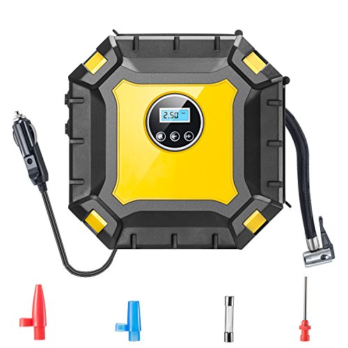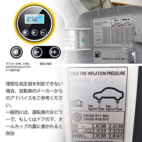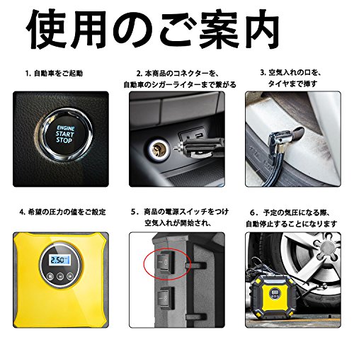 - 【携帯便利と便利に空気入れ方法】弊社の携帯用エアコンプレッサー(7.1*7.1*3.7in)は片手で持つことができます。それに、使い法はとても簡単です。タバコソケットを車のコンセントに差し込んで、電源を入れて、指定の気圧を設定してください。ご指定の気圧が設定後、ONボタンを押します。設定気圧になりましたら、自動的に停止します。さらに、他のタイプより、空気の速度は速く、35L/MINで、四分以内でP195/65R15のタイヤの気圧は35lb/ in.²になります