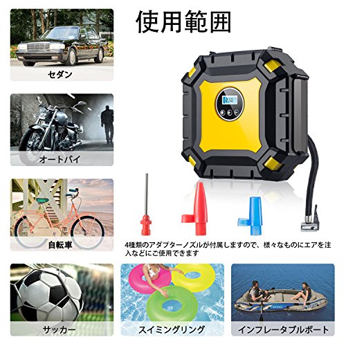 - 【幅広い場面で使える】携帯エアコンプレッサー、車用空気入れはタイヤに空気入れることだけではなくて、圧力計付でタイヤの圧力測定が行え、デジタル表示で、簡単に読み取れます。そして、三種のアダプターが付き、自動車、トラック、自転車、バイク、キャンピングカー、SUV、バギー、モーターボート、バスケットボール、サッカーボール、エアークッションにエアを注入などにご使用できます