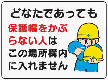 イラスト標識 WE1 どなたであっても保護帽をかぶらない人はこの場所構内には入れません クリーンエコボード製 450×600mm
