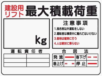 イラスト標識 WE6 建設用リフト最大積載荷重 クリーンエコボード製 450×600mm