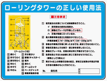 イラスト標識 WE12 ローリングタワーの正しい使用法 クリーンエコボード製 450×600mm