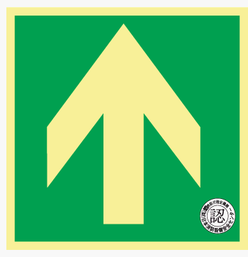 表面を透明フィルムラミネート加工してありますので、耐水性、耐薬品性、耐摩耗性を有しています。財団法人日本消防設備安全センターにより「認定」が行われ、適合している製品には「認定証票」が交付され、認定証票の表示が付された蓄光式誘導標識は、 消防法施行規則第31条の3の規定により設備等技術基準に適合したものとみなされ、消防機関が個別に性能確認試験を行う必要がなくなります。