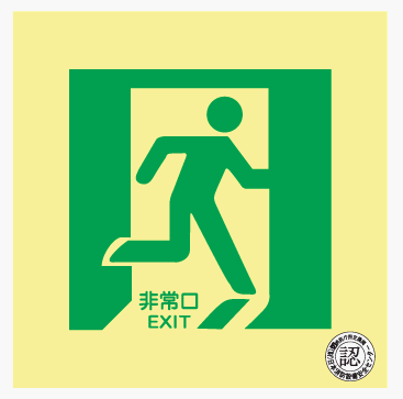 表面を透明フィルムラミネート加工してありますので、耐水性、耐薬品性、耐摩耗性を有しています。財団法人日本消防設備安全センターにより「認定」が行われ、適合している製品には「認定証票」が交付され、認定証票の表示が付された蓄光式誘導標識は、 消防法施行規則第31条の3の規定により設備等技術基準に適合したものとみなされ、消防機関が個別に性能確認試験を行う必要がなくなります。