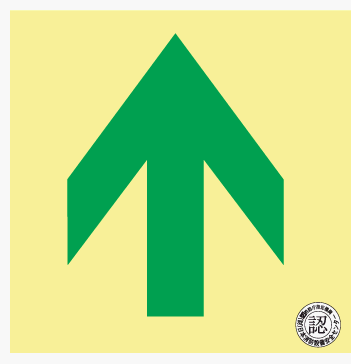 表面を透明フィルムラミネート加工してありますので、耐水性、耐薬品性、耐摩耗性を有しています。財団法人日本消防設備安全センターにより「認定」が行われ、適合している製品には「認定証票」が交付され、認定証票の表示が付された蓄光式誘導標識は、 消防法施行規則第31条の3の規定により設備等技術基準に適合したものとみなされ、消防機関が個別に性能確認試験を行う必要がなくなります。