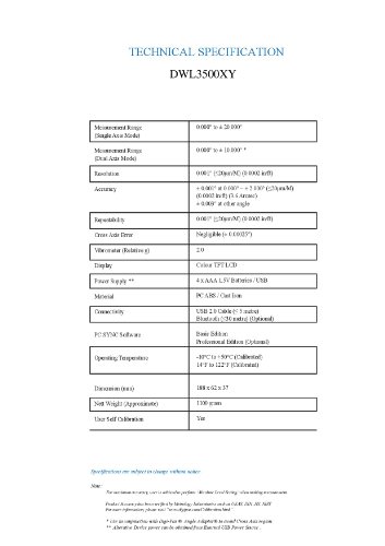 DWL 3500XYは産業ユーザーや専門家向けに設計された高精密水準器です。2軸同時測定可能の他、もちろん単軸としても測定可能です。この製品には振動計を内臓しており、角度測定だけではなく、角度測定時に受ける振動を計測する事で、それに影響される問題を解析出来る製品になっております。ソフトウェアをPCにインストールする事で、デジタル水準器とPCを接続(USB接続)し、データ収集、データ出力、Microsoft Excelへの展開をする事で、日々の影響をモニタリングする事が出来て、問題点を見つけ易くなります。製品の精度は、米国、日本、英国と独国にある第三機関の測定、試験 機関によって検証されております。 NISTはJIS、UKAS、DINはILAC、A2LAに属します。更に製品には自己公正機能も搭載しておりますので、アクシデントにより製品落下衝撃等でのユーザーが不安に思う精度低下において、一時的に自己公正をする事でお使い頂けます。もちろん弊社へ御問合せして頂く事で、再校正対応も可能です。主に使用用途として計測器、鉄道メンテナンス、精密機械の基準設定、スライス盤の設置基準出し、平面研磨機の設定基準出し、測定機器の設定基準出し、研究所(光、ビジョン)での利用価値は十分あります。本製品の精度性能は、一般財団法人日本品質保証機構(JQA)で校正し発行された校正証明書(複写版)をご参照ください。該当校正証明書は、当社のホームページで閲覧ができます。詳細については、www.digipas.co.jp をご覧ください。なお、ご購入の製品についての校正証明書が必要な場合は、JQA等の校正証明機関へ直接お問合せ下さい。
