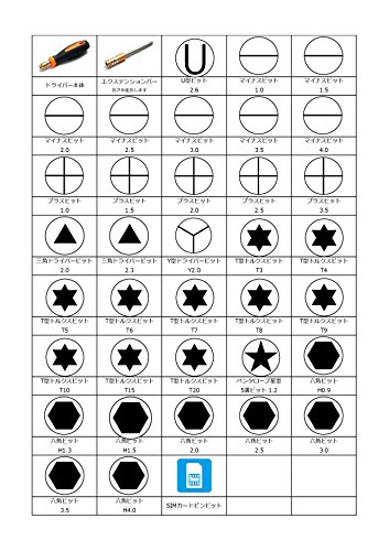 - セット内容:ドライバー本体 エクステンションバー マイナスビット プラスビット 三角ドライバービット Y型ドライバービット T型トルクスビット ペンタローブ星型5溝ビット U型ビット 六角ビット。(ビットのサイズ等の詳細は画像内の一覧表をご参照下さい)