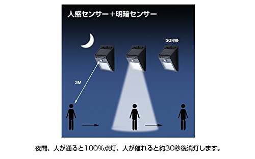 - 自動PIRモーションセンサーで、人の動きを感知すると自動的にフル点灯し、30秒前後で消します。