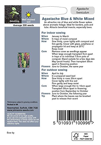 First Year Flowering Perennials Agastache Blue & White Mixed ファースト・イヤー・フラワリング・ペレニアル・アガスタチ・ブルー&ホワイト・ミックス【シソ科/耐寒性多年草】 ◆草丈:約60cm◆株間:約40cm ◆ブルーとホワイトの香りの良い宿根草。日当りの良い乾燥気味の土壌を好む多年草です。 ◆播種時期:3~5・9~11月◆開花時期:5~9月◆発芽適温:20℃ ◆発芽まで:14~28日 ◆プラグトレイ&シードトレイ播き:摘めるようになったら9cmポットに仮植し、根が十分に回わり本葉5〜6枚になったら用土を崩さずに慎重に定植します。 ◆種子内容量:約200粒*粒数はあくまで『約』です。◆採種国:オランダ◆初めての品種は一度に播くのではなく何度かに分けてお試し下さい。 ◆英国の実験室内での発芽率試験結果:70%*お客様の発芽率を保証するものでは有りません。大体の目安とお考え下さい。 ◆品種の耐寒性・特徴・用途・栄養分・調理法等:Hardy Perennial・耐寒性多年草:First Year Flowering Perennial・早期の播種で播種したその年に開花出来る多年草。:Full Sun・日当たりの良い場所で栽培する。:Fragrant・芳香性があり香りも楽しめる。:Suitable for Pots・ポットやプランターでも栽培出来ます。