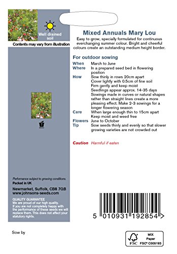 Mixed Annuals Mary Lou ミックスド・アニュアルズ・メリー・ルー ◆栽培が簡単で初心者でもOKです。夏中色々なカラーを次々と映し出します。ホットで輝きのある印象の背丈の中ぐらいの存在感のある一年草ミックスです。『ハロー・メリー・ルー』はリッキー・ネルソンの名曲から名付けられました。 ◆草丈:60cm ◆播種時期:3~6月◆開花時期:6~10月◆発芽適温:15~24℃◆発芽まで:14~35日 ◆播種方法:直播きして混み合ったら間引く。 ◆種子内容量:約1g*粒数はあくまで『約』です。◆採種国:英国◆英国の実験室内での発芽率試験結果:60%*お客様の発芽率を保証するものでは有りません。大体の目安とお考え下さい。*初めての品種は一度に播くのではなく何度かに分けてお試し下さい。 ◆品種の耐寒性・特徴・用途・栄養分・調理法等:Hardy Annual・耐寒性一年草 *寒冷地以外では秋蒔きが可能な品種が多くあります。:Full Sun・日当たりの良い場所で栽培する。:Attractive to Butterflies & Bees・蝶やミツバチなどの益虫が寄ってくる。:Wildflower・ワイルドフラワー品種。:Wildlife Garden ワイルドライフ・ガーデンが楽しめます。