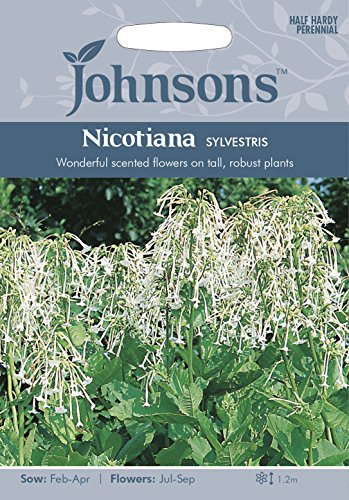 Nicotiana sylvestris ニコチアナ・シルベストリス 【ナス科/半耐寒性多年草】 ◆切込みの無い葉の上に香りの素晴らしい白い花がかたまって垂れ下がって咲きます。 ◆草丈:約120cm◆株間:約50cm ◆播種時期:2~5月◆開花時期:7~9月◆発芽適温:15~20℃ ◆発芽まで:14~28日 ◆プラグトレイ&シードトレイ播き:摘めるようになったら9cmポットに仮植し、根が十分に回わり本葉5~6枚になったら用土を崩さずに慎重に定植します。◆ポット播き:根が十分に回わり本葉5~6枚になったら用土を崩さずに慎重に定植します ◆種子内容量:約2000粒*粒数はあくまで『約』です。◆採種国:オランダ◆初めての品種は一度に播くのではなく何度かに分けてお試し下さい。 ◆英国の実験室内での発芽率試験結果:85%*お客様の発芽率を保証するものでは有りません。大体の目安とお考え下さい。 ◆品種の耐寒性・特徴・用途・栄養分・調理法等:Half Hardy Perennial・半耐寒性多年草 *戸外での越冬には防寒対策が必要です。鉢に植えて屋内で越冬する。:Full Sun・日当たりの良い場所で栽培する。:Fragrant・芳香性があり香りも楽しめる