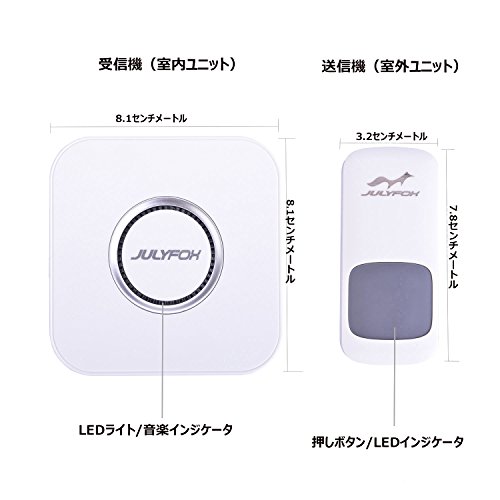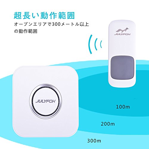 - Julyfoxワイヤレスドアベルは高感度受信機採用で、電波の飛距離は屋外見通し,最大1000フィート/300メートルの無線範囲をサポートします。