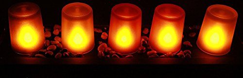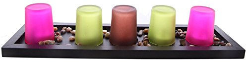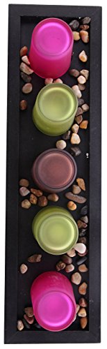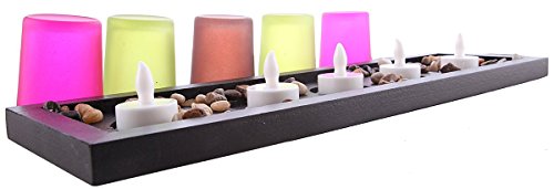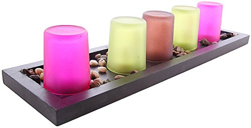 Dimensions: Stand 17.3 x 5 x 1 inches. Includes 5 solid glass votive candle holders with a custom wooden display base. Set comes with polished multi colored river rock accents to compliment decor. The designer jewel tone glass brings dramatic style and sophistication to any home or office. Includes 5 tea light battery operated candles with on/off switch.