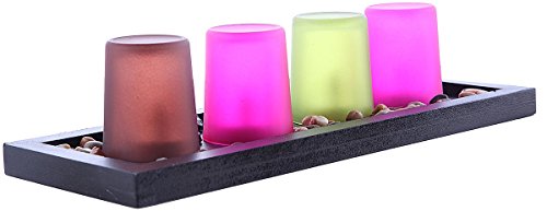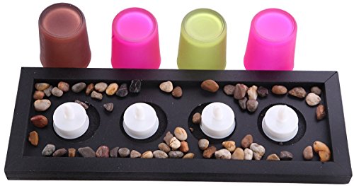Dimensions: Stand 13.4 x 5 x 1. Includes 4 solid glass votive candleholders with a custom wooden display base. Set comes with polished multi colored river rock accents to compliment decor. The designer jewel tone glass brings dramatic style and sophistication to any home or office. Includes 5 tea light battery operated candles with on off switch.