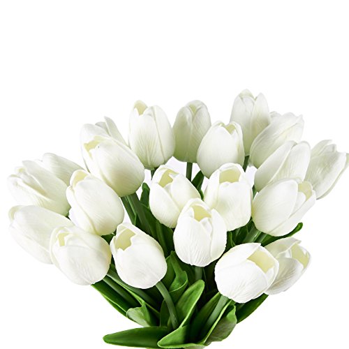 人工花 – シルク花チューリップブーケ、ウェディングパーティー用フェイク花、バレンタインの日、ホーム装飾、24束、ホワイト