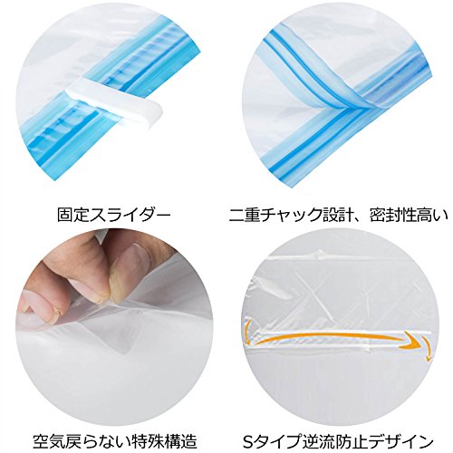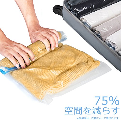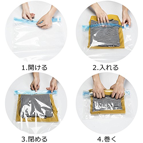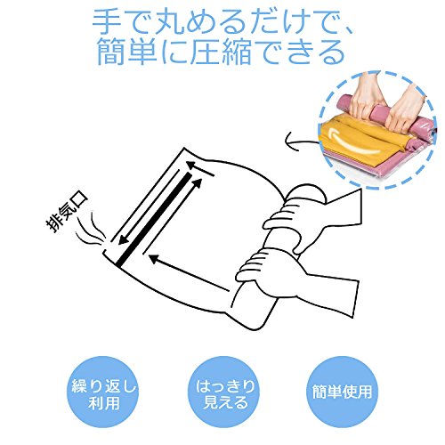 ●押さえるだけで、衣類を約1/2にスピード圧縮! ●吸引不要! 上から押さえ、手で丸めるだけで空気が抜ける ●気密性の高いファスナーで、空気を漏らさない! ●簡単に密閉ができるスライダーチャック式 ●【旅行でも大活躍】 かさばる衣類がコンパクトになり、スーツケースもすっきり ●【衣替えにも便利】スペースを有効利用でき、たくさん収納できる ●透明な袋なので、ひと目で中身がわかる ●繰り返し利用可能! ●使用の目安(袋1枚):セーター1~2枚 ※衣類の素材や形状により、圧縮率は変わる