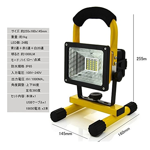 商品説明 サイズ:約255x160x145mm 重量:約1kg LED数:24粒 入力電圧:100V-240V、出力電圧:6V/1000MA。 明るさ:(参考値)約1000LM/(実測値)700LM 使用寿命:約100,000時間 角度調整:上下:90度; 左右:360度 三つ点灯モード:高照度→低照度→点滅の切り替え可能 セット内容:本体x1;USBケーブルx1;18650電池 x3本(※18650電池は充電池で、保護回路付です。)(※18650型電池は市販のものと交換可能です。)(※18650電池の色はランダムです。) 防水規格:IP65 IP65防水規格で、雨天でも影響がございません。ガーデンライトとしても、工場現場も適用です。ご安心ください。 点灯角度調節可能! 横回転360°上下90°でムラなく広角照射しますのでとても便利です! モバイルバッテリー作用:外出時、モバイルバッテリーとして、マートフォン・タブレットなどに充電することができます。 釣り、キャンプ、アウトドア、夜間作業、乗用車等での積み卸し、現場工事、駐車場、集魚灯、作業灯にも様々な場所で活躍します。
