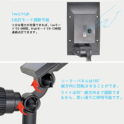 - 【エコな照明】:ソーラーパネル(5V/2W)を利用する充電式で、電気代一切要らない経済的な照明です。点灯モードはLowモードとHighモードがあり、必要によって、モードを選べます。十分な電力が充電できれば、Lowモードで5-6時間、Highモードで9-12時間連続点灯できます。