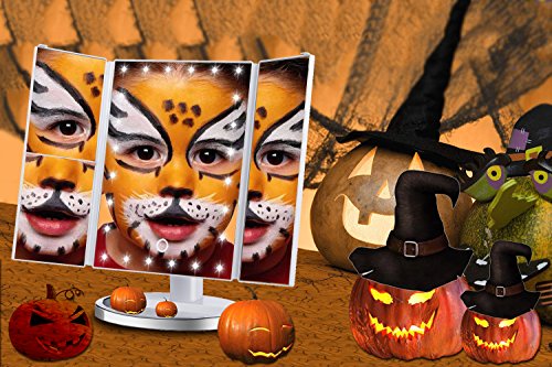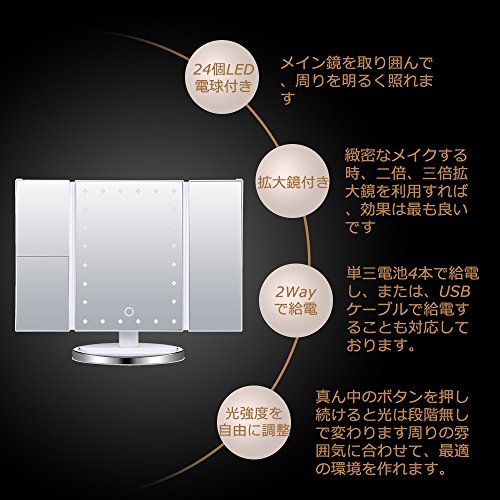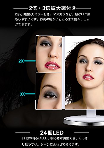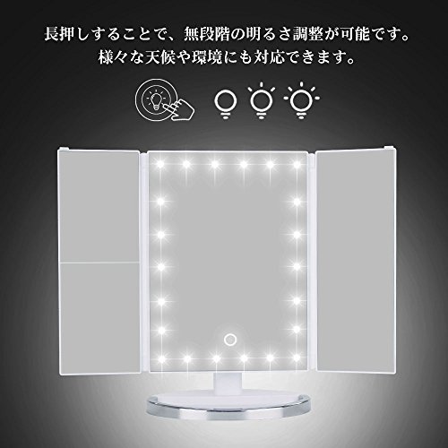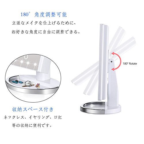 - ▶【24個電球付き・明るさ調整可能】LEDライト付きのミラーを使って女優気分でメイクしましょう。そして本当の肌色を映すミラー。よりいっそう美人に!暗いところや薄暗い状況でもメイができます。タッチパネル式なスイッチで、使用する際にとても便利です。タッチパネルで長押しすると好みに合わせて簡単に明るさも調整できます