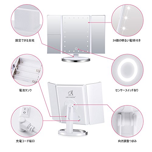 LEDライト付き 化粧鏡 メイクミラー 卓上ミラー 2倍&3倍拡大鏡 折りたたみ式 テーブル 電池式 USB充電兼用 角度&明るさ調整可能 KEYNICE 製