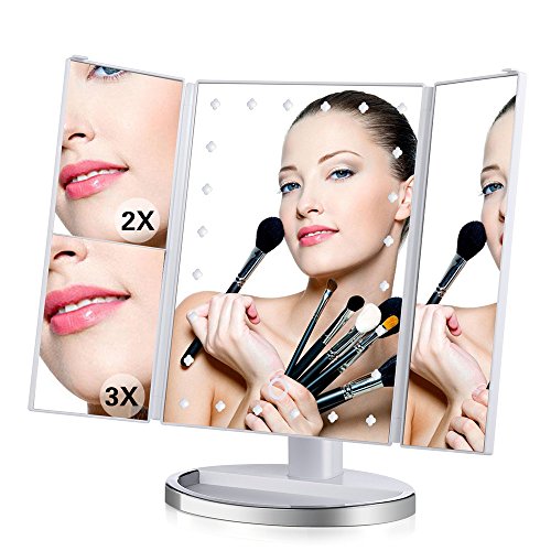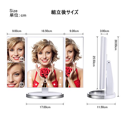 - ▶【折り畳み式の三面鏡】2倍・3倍拡大鏡と普通鏡を合わせて設計したフォールド式の女優ミラーです。多面鏡だからお顔全体や横顔もしっかり映ります。正面だけでなく、普段見づらい斜め、横顔もチェックできます。また、鏡本体は180度傾けることが可能ですので、快適な角度でメイクできます。