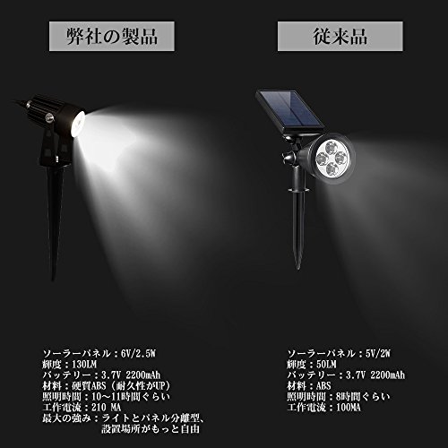 - 【特長とするポイント】:類似物と異なって、こちらの製品はソーラーパネル本体とLEDライトが分離型となっており、ケーブル(6メートル)で連結する仕様のために、普段日陰となってしまう場所の照明にご利用いただきたい場合に、日当たりの良い場所にパネルを設置し、日かげにライトを設置することで実現できます。日照時間不足による“非点灯のストレス”を解消します。