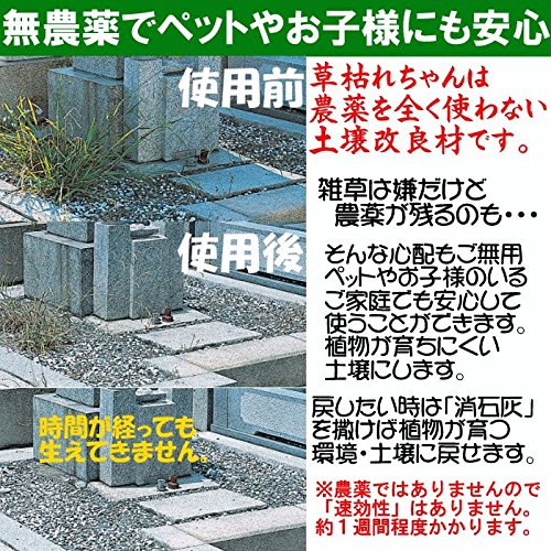人、ペット、地球に無害で除草できる環境に優しい完全無農薬の除草材です。使用後、酸性化された土壌に改良されて雑草などの芽が出にくくなります。1kgで約1~3平方メートルを目安に直接雑草や土に撒き広げて下さい。