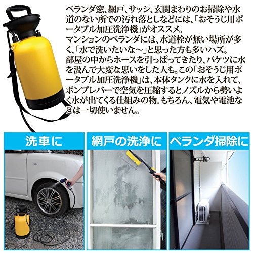 - ベランダの窓、網戸、サッシ、玄関まわりや洗車など、水道のない所でのお掃除に便利な「おそうじ用ポータブル加圧洗浄機」です。