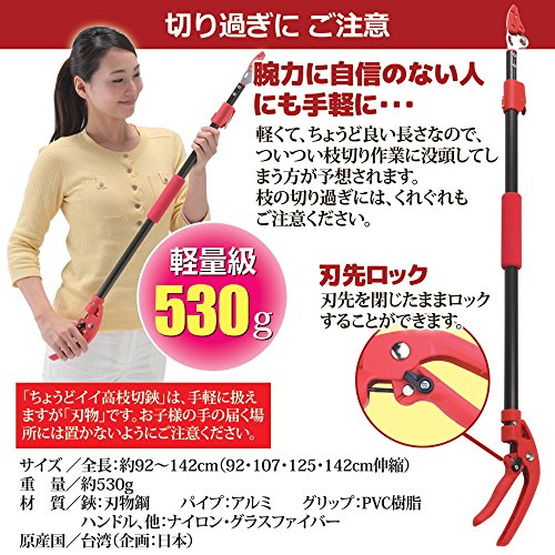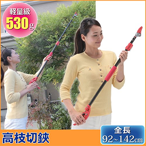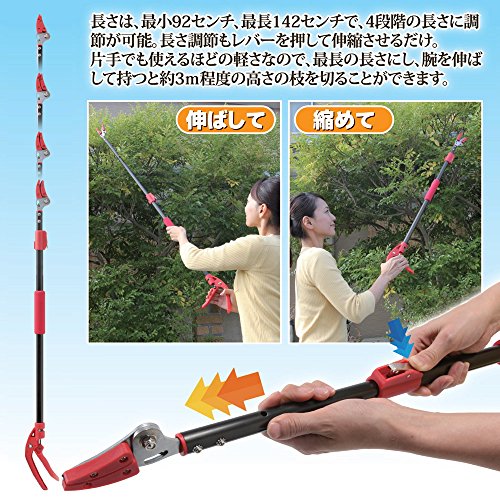 - 軽量で4段階の長さ調整(最小92~最長142cmの伸縮式)ができる高枝切り鋏です。ご自宅の庭木やガーデニングに使い勝手のいい高枝切鋏です。