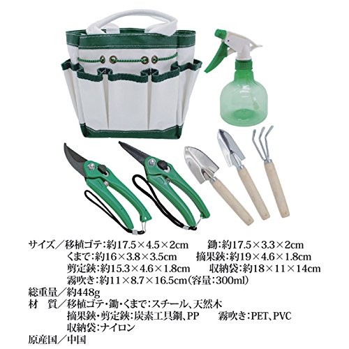 [サイズ(約)]移植ゴテ:17.5×4.5×2cm、鋤(すき):17.5×3.3×2cm、くまで:16×3.8×3.5cm、摘果鋏:19×4.6×1.8cm、剪定鋏:15.3×4.6×1.8cm、霧吹き:11×8.7×16.5(容量300ml)、収納袋:18×11×14cm