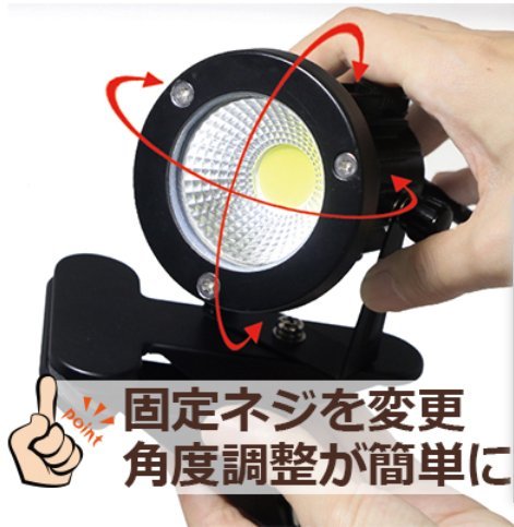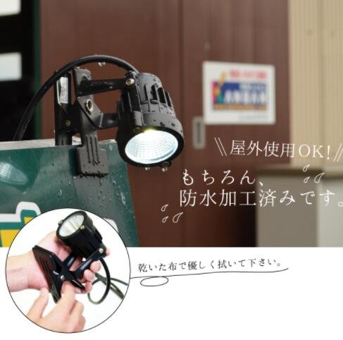 LED電球を採用した看板や屋外、倉庫などの作業用に最適なクリップライト。 消費電力が白熱電球に比べて約1/8と少なく、省エネで長寿命(約30,000時間) 屋外でも使える防雨型(IP65)です。 ライトをしっかり支えるクリップがついているので、看板や板などを挟んで使えます。 ライトの角度は調整出来ます。 LED電球は、白熱球と比べて振動や衝撃に強く、高い耐久性があります。