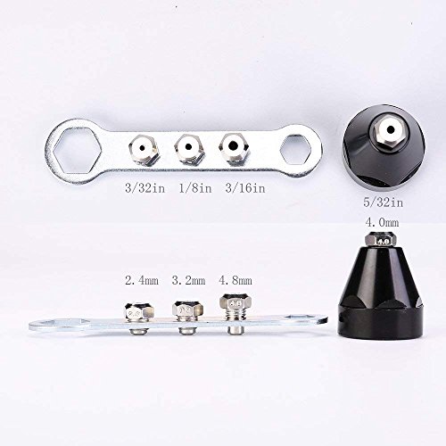 - 製品パラメータ 軽量:544g ノズルサイズ: 3/32", 1/8", 5/32" and 3/16" 最大回転数: 1000 RPM 最小トルク強度: 50N.m アルミニウム: 2.4mm-4.8mm 鋼: 2.4mm-4.8mm 六角シャンク:8.35mm