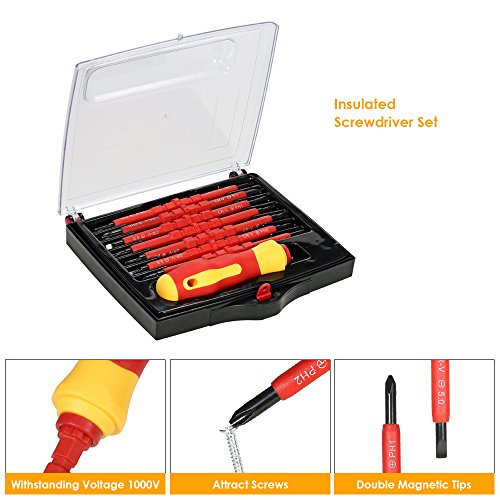 KKmoon 7 in 1 絶縁ドライバー セット1000V耐圧 交換可能 磁気付き プラス 溝付ビット スクリュードライバ 電気工事 電工 修理ツールキット