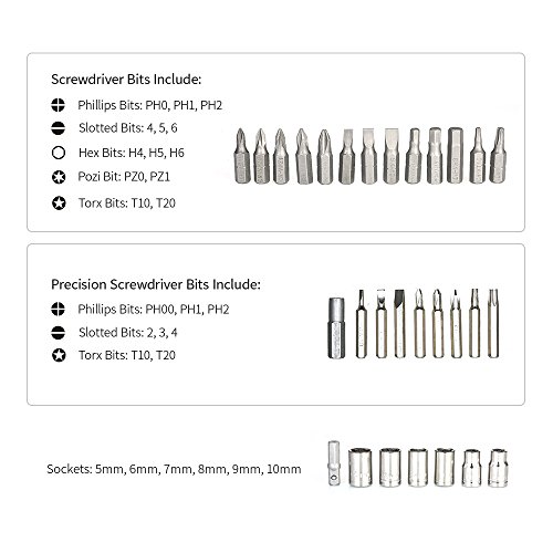 - 様々な要求に応えるための13個のドライバービット、6個のソケット、8個の精密ドライバービットが含まれています。