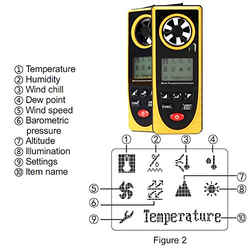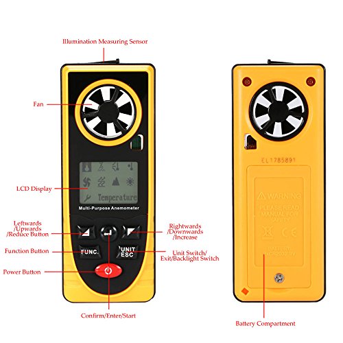 - これは、温度、湿度、風の寒さ、露点、気圧と照明を測定することができ、また、風速を測定することができるだけでなく、多機能携帯型風速計です。バックライトを使用すると、簡単には夜に値を読み取ります。