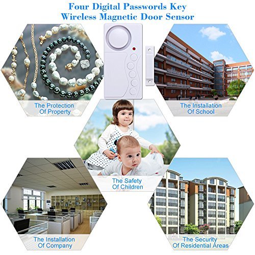 This product is wireless magnetic sensor, it will alarm when detect someone come in. It has four digital password and on/off key, which has the arm,doorbell and close door remind functions. It is widely used in shop,supermarket,office and other needed places.