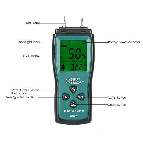 - 多くの種類の木材の含水率をすばやく測定できます。ウッド2%〜70%RH、解像度:0.5%±(1%RH + 0.5)、精度:±0.5%。