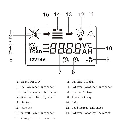 - ★負荷制御モードを選択できて、タイマー機能は夜の街灯のためにリセットすることができます。LCDディスプレイ搭載し、2つのボタンで操作を行えます。