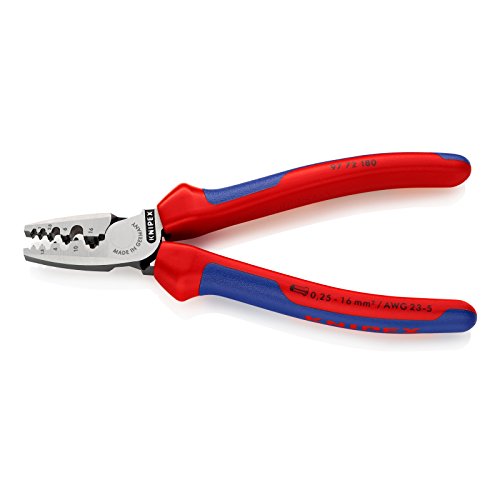 - Price For: Each Item: Insulated Crimper For Use With: For 0.25 to 16mm2 Crimping End Sleeves Features: 2-Component, Comfort Grip Handle, Crimps In Half Marked Round Dies, 9 Deep Troughs with Conical Side Faces Capacity: 23 to 5 AWG Strips: No Overall Length: 7-1/4" Adjustable: Manual Handle Type: Ergonomic Standards: DIN 46228 Parts 1 + 4 Cuts: No